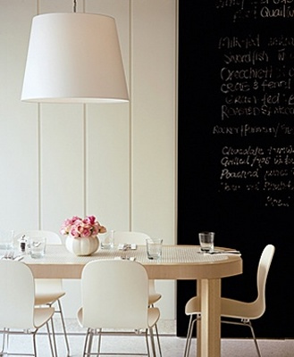 I'm seriously considering painting one wall in my kitchen with black chalkboard paint. I think it will make the kitchen look a little less formal and is an inexpensive project! Here are a few pictures of chalkboard walls I'm loving. I'd love to hear what you all think!